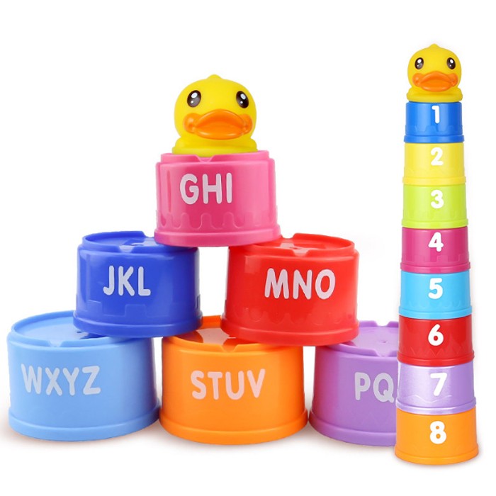 1. La taza apilable consta de 8 tazas pequeñas a grandes, una cabeza de pato y la parte delantera y trasera de la taza tienen 26 letras y 8 números.